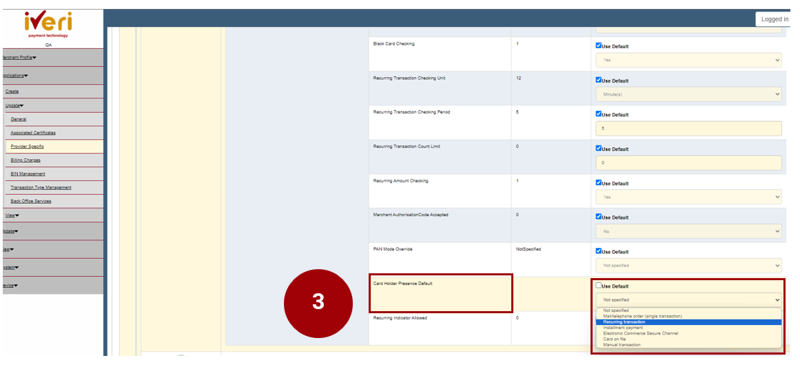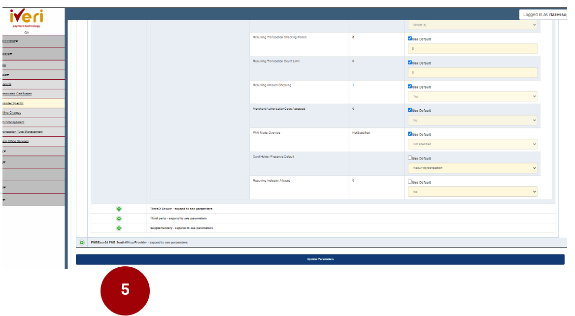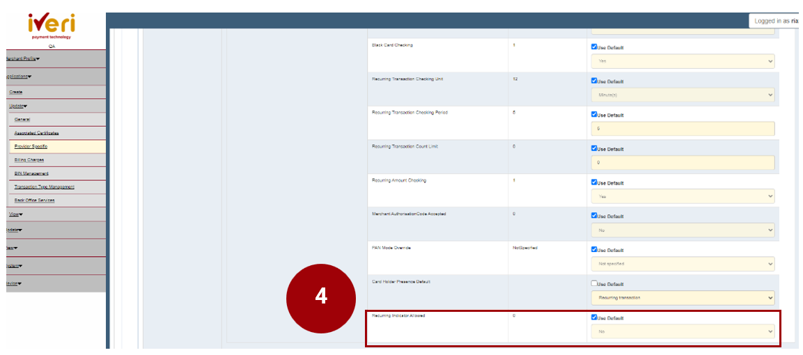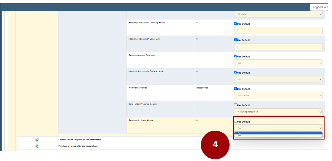 4. The next parameter that needs to be update is the ‘Recurring Indicator allowed’.